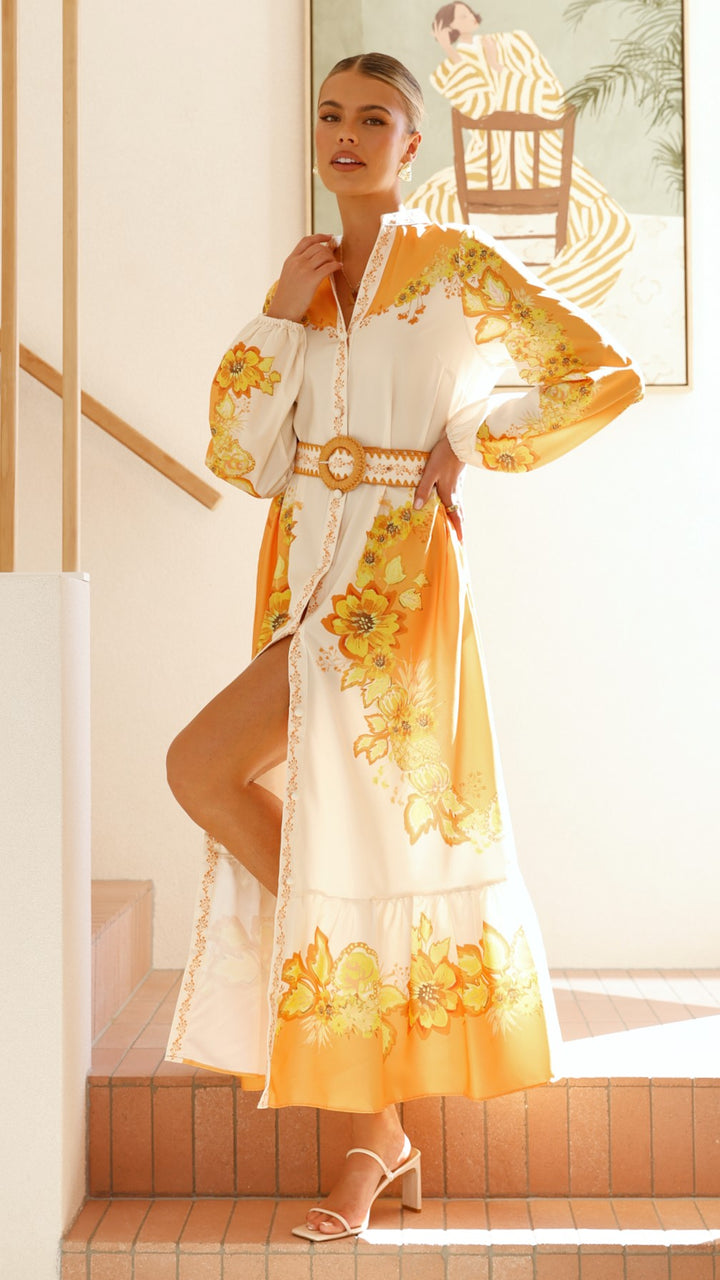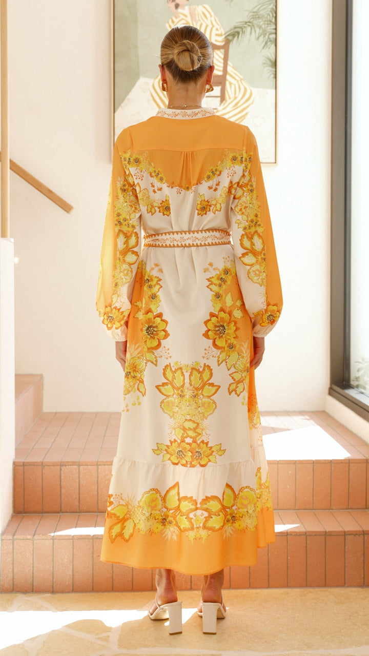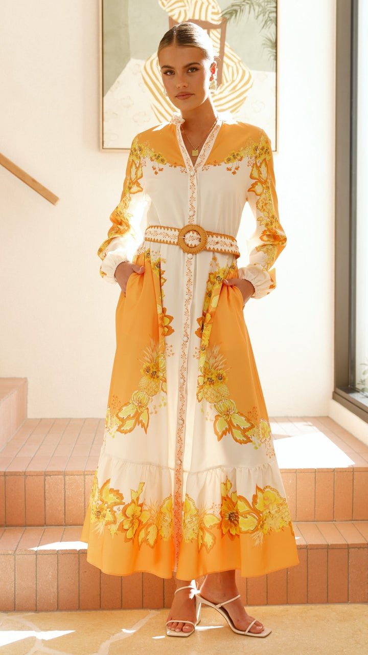 Addison Uzun Elbise - Turuncu/Sarı Çiçek Desenli