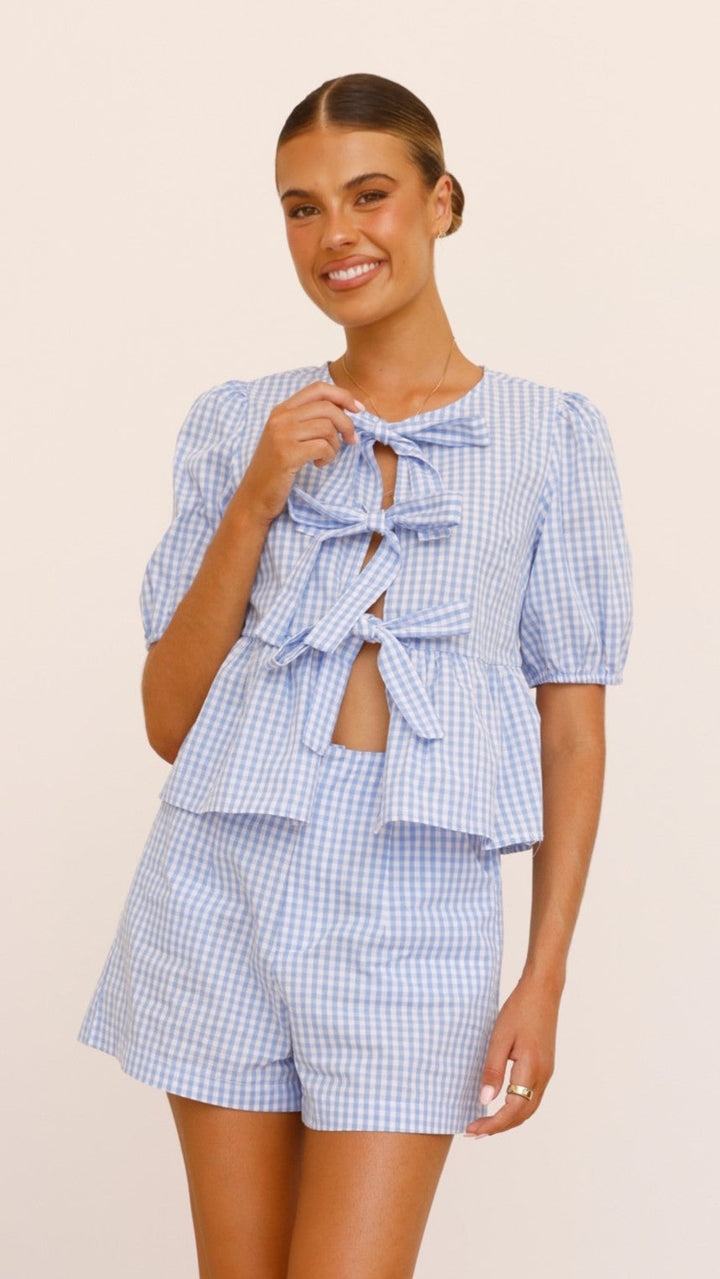 Belle Önden Bağlamalı Gömlek - Mavi Kareli