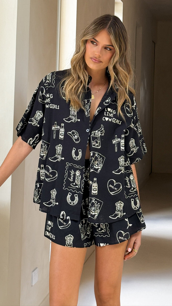 Charli Düğmeli Gömlek Ve Şort Takımı - Siyah/Bej Kovboy