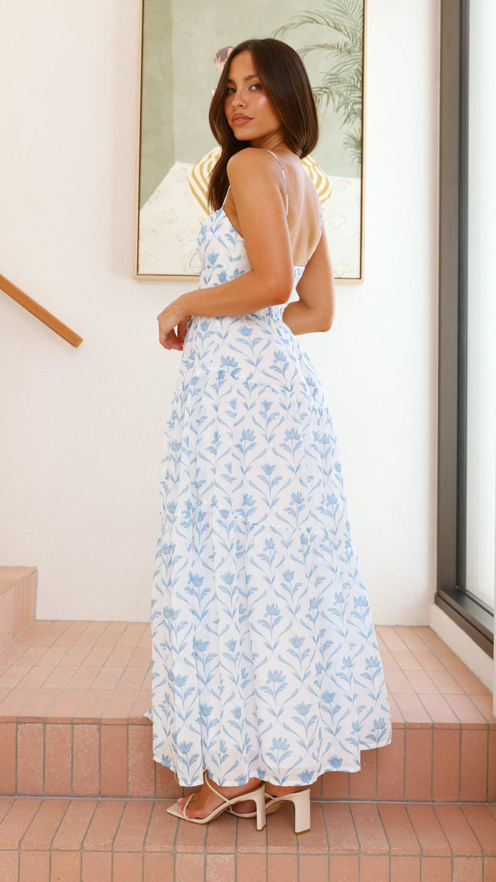 Cove Uzun Elbise - Mavi Çiçek Desenli