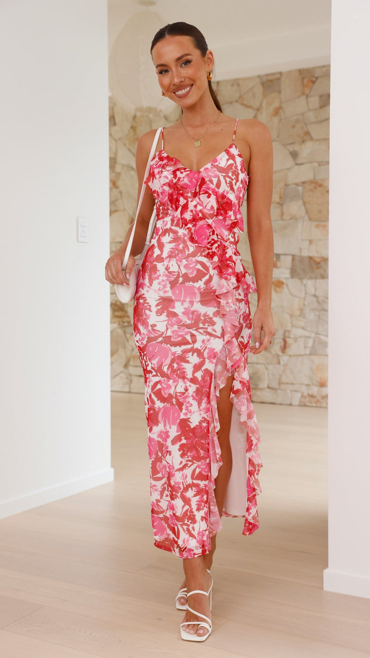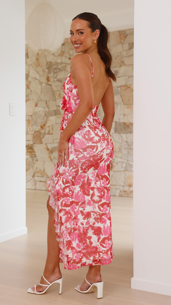 Debbie Midi Elbise - Pembe/Kırmızı Çiçek Desenli