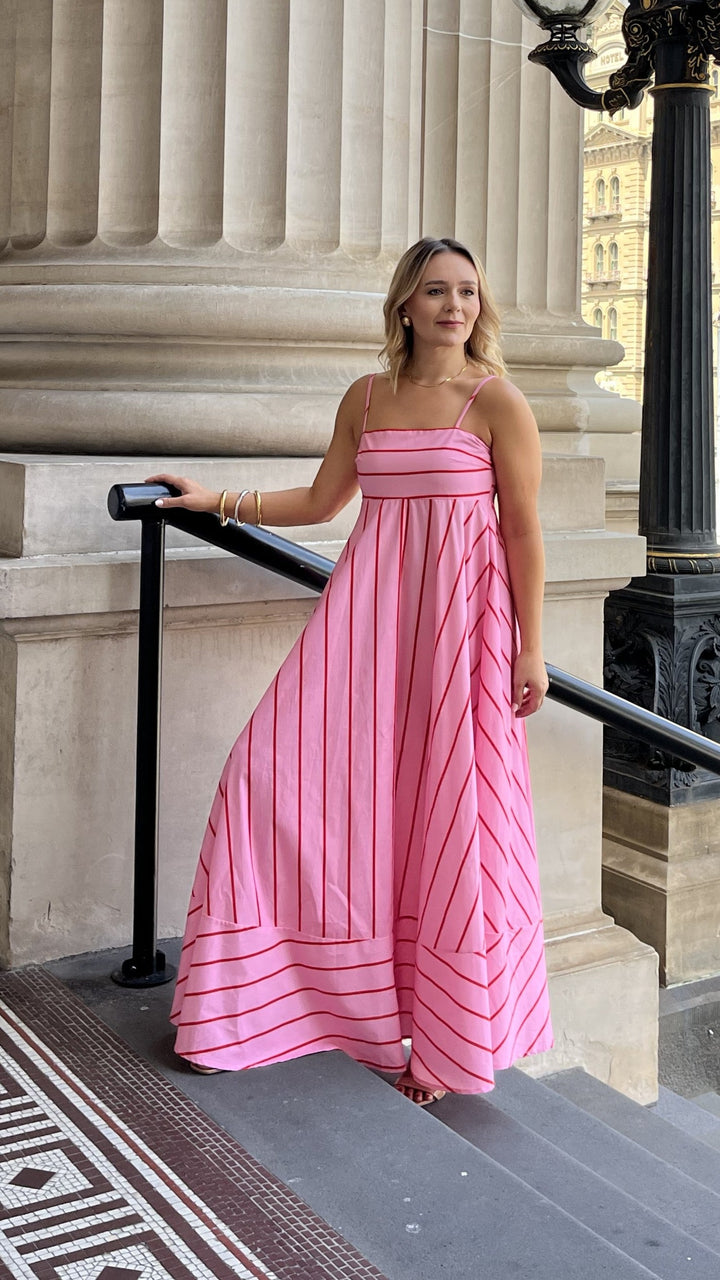 Kaethe Uzun Elbise - Pembe / Kırmızı Çizgili