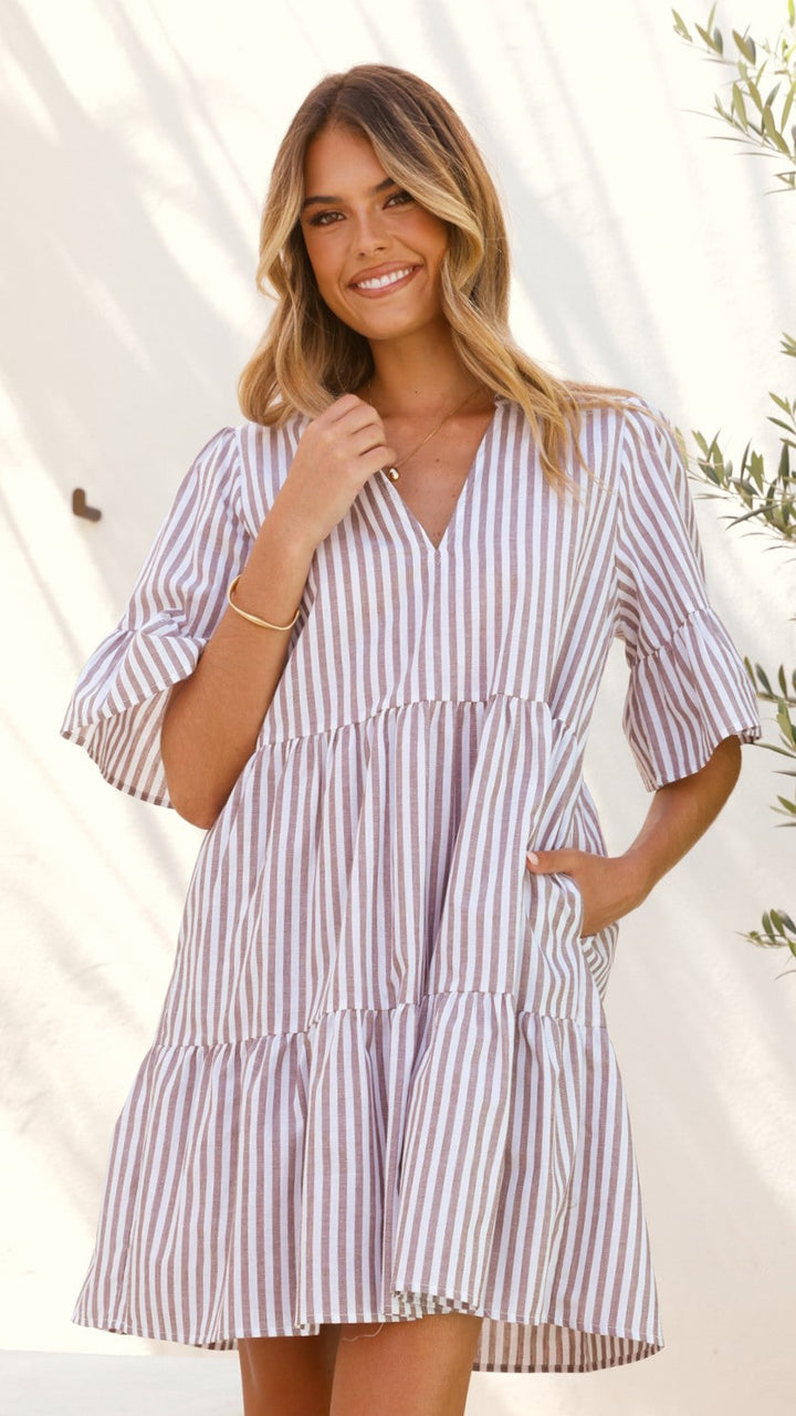 Tarnie Mini Elbise - Kahverengi Çizgili