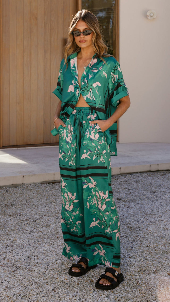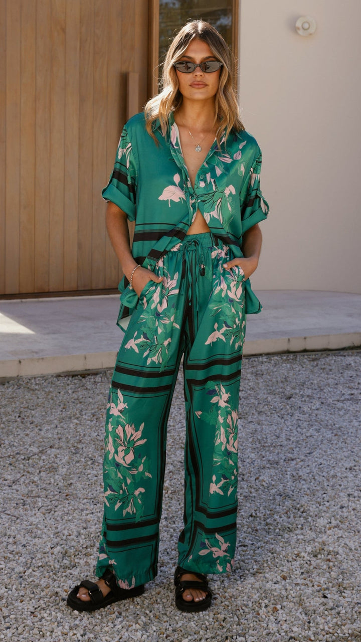 Vallerie Düğmeli Gömlek - Yeşil/Pembe Baskılı