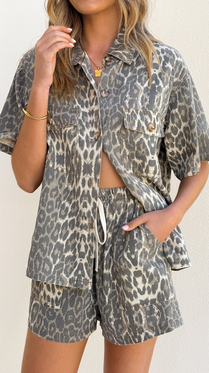 Vasila Düğmeli Gömlek Ve Şort Takımı - Açık Leopar Desenli